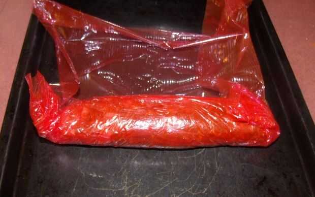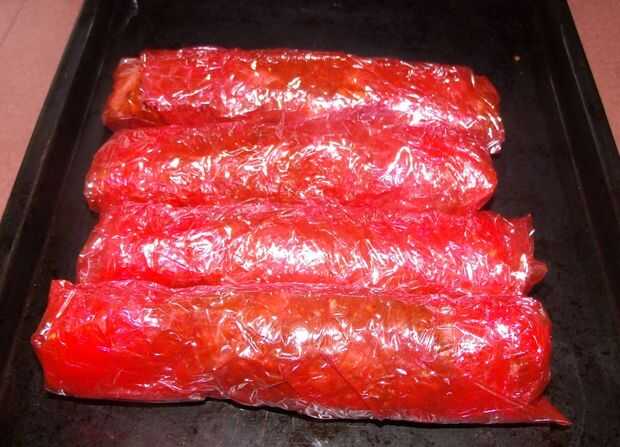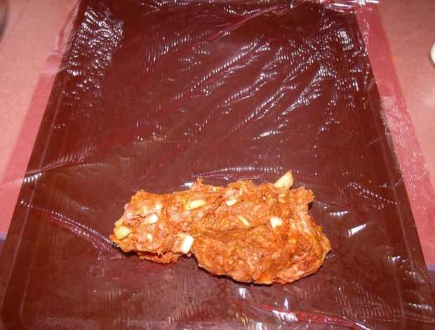 mezclar todos los ingredientes y divida en porciones iguales, endecha una pieza de plástico abrigo abajo y coloque una porción de la mezcla de carne en la envoltura, tirar 1/3 de la envoltura sobre la carne y hacer un cilindro apretado luego Envuelva el resto de la envoltura plástica alrededor de la carne, asegurándose de que se meta en los extremos antes de llegar al final. Coloque los troncos de carne preparada en el congelador hasta congelados