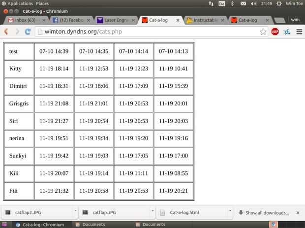 Cada vez que un gato pasa la catflap, el RFID es leído, almacenado en una base de datos y publicado en Internet como se muestra arriba