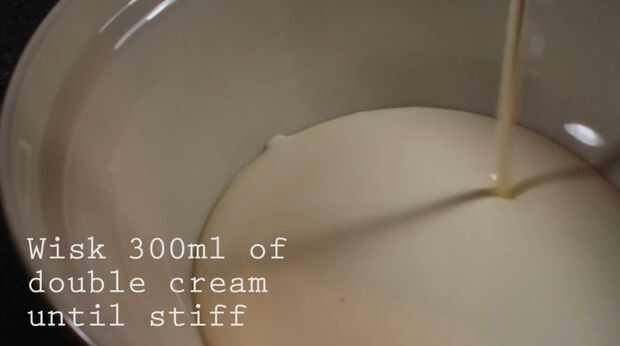 Batir 300ml de crema doble hasta que esté espesa (esto requiere algo de paciencia y resistencia)