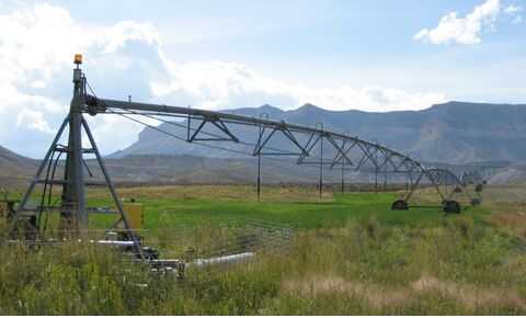 El sistema de riego pasó a ser del estilo de pivote de centro. En este caso hubo un pozo cavado en un extremo del campo (que recoge el agua). Se bombea agua de la charca, hacia fuera al centro del campo por medio de 8" pipa de la irrigación (puesto en el suelo) a la pivote central. A partir de ahí las múltiples secciones sobre ruedas, todos conectados juntos pivote (extremo a extremo) alrededor del punto pivote, haciendo un círculo completo.