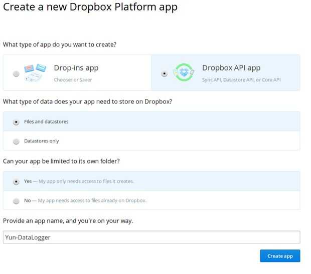 A continuación, vaya a la consola de aplicaciones Dropbox aquí: https://www.dropbox.com/developers/apps/create