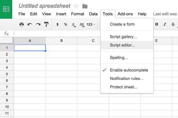 Inicie sesión en su cuenta de Google y la cabeza sobre a disco. Seleccione "Mi coche" > "Nuevo archivo" > "Google hojas" para crear una nueva hoja de cálculo. A continuación, seleccione "Herramientas" > "Editor de scripts" para crear un nuevo script. Pegar en el script del archivo adjunto demo e Insertar el ID de dispositivo y el Token de acceso de su cuenta de Spark.io.