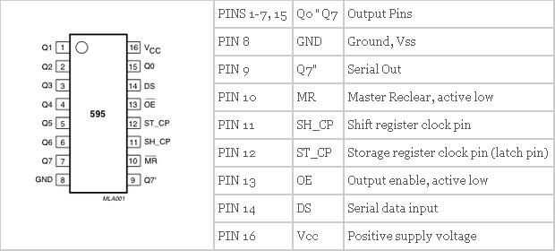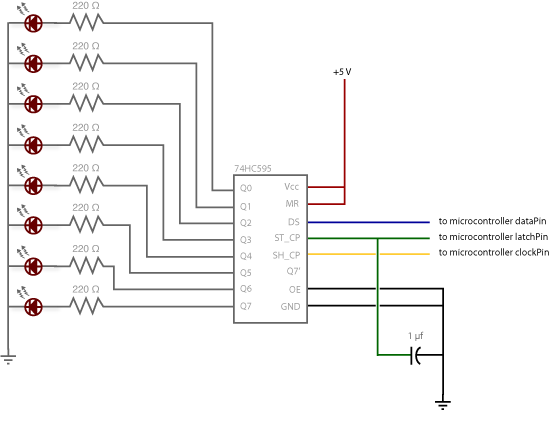 El concepto básico es que tiene 8 pines de salida de los 74HC595. Este ejemplo permite decir que estas se envían a través de una resistencia de un LED. Así que tenemos pins Q0 a Q7 como los pines de salida. El resto puede considerarse pines de control, su función exacta es contornos en el cuadro anterior.