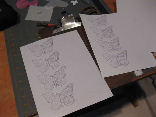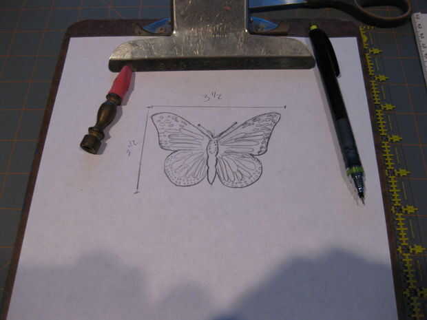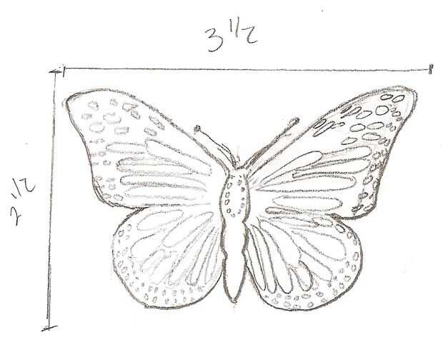 Miré en internet por fotos y vino para arriba con el monarca. Utilicé mi dibujo a lápiz y hacer referencia a las fotos en la pantalla; Crear mi patrón dibujando sobre el papel de diseño. Hice una dibujo en primer lugar la luz y luego pasó a oscurecer el diseño. Una vez que terminé de dibujo; Escaneé el patrón de mi papel del diseño en la computadora. Utilizando el programa paint de Microsoft capturó (opción copia) la imagen y había transferido encima a MS Word. De allí redimensionada el dibujo a 2 1/2 pulgadas de altos por 3 1/2 pulgadas de ancho. Me gusta el software de documento de word, porque puedo hacer copias rápidas. De todos modos de allí - hizo varias copias en el programa, para caber en una sola página. Imprimí la página completa en un 1 peso pesado-110 libras papel blanco y en papel de blanco de 20 libras peso ligero uno 1.