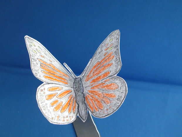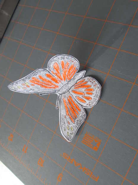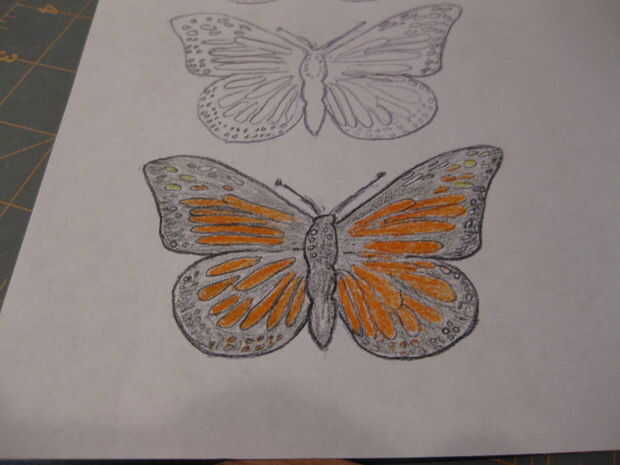 Me parece más fácil de color en la mariposa mientras que sigue siendo parte de la hoja. Usé mis lápices de color a color en dos mariposas diferentes. Una vez que el colorante se hizo; Les corté la hoja con las tijeras.