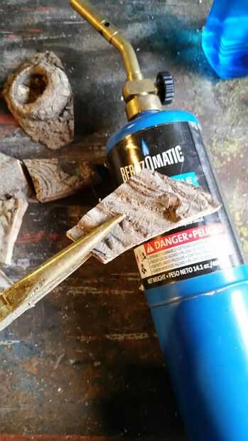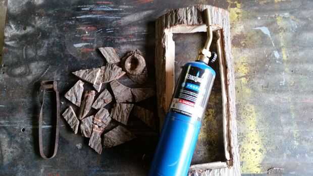 Bueno ahora tome el pedazo de madera cortado anteriormente. Cortar la corteza del lado aproximadamente 1/4" espesor y en pequeñas piezas de forma extrañas. Cortar palitos de madera para recortar los bordes, en cuanto a ocultar el labio bajo el plexiglás tanto como sea posible. Colocar el plexiglás de 5 "x 12" en la parte superior del tronco y encajar piezas pequeñas a tu gusto. Mantener algunos espacios entre cada pieza para que la luz puede brillar a través. A continuación se quemará la madera para darle ese dulce de la mirada de la chimenea.