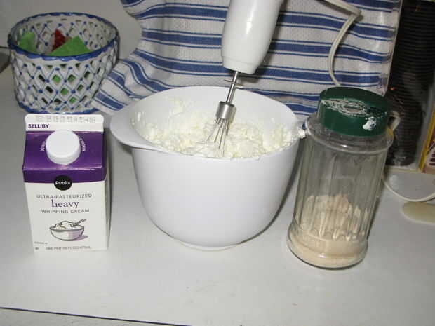 O.K. permite empezar! empezar por verter toda la crema en el bol para mezclar, comience mezclando con tu wisk o batidor eléctrico después de aproximadamente 1 minuto de agitación añadir azúcar (ser generoso) ahora revuelva durante unos cinco minutos más añadir más azúcar no tanto esta vez después de unos 8-10 minutos se debe batir crema no revuelva más después se convierte en nata o haces mantequilla mantequilla muy dulce!!