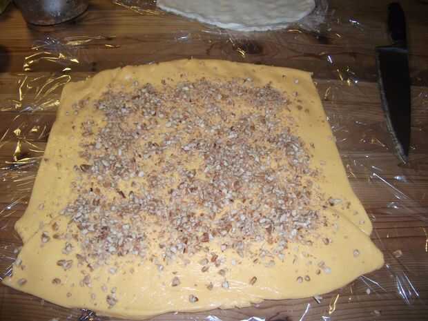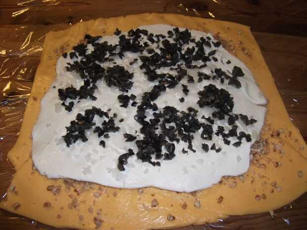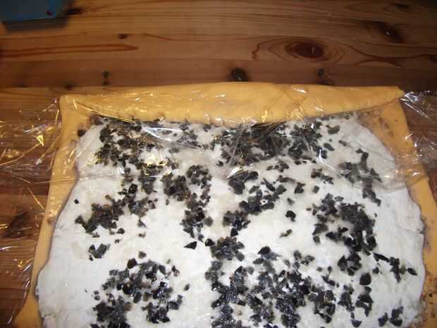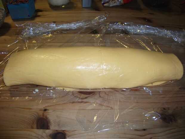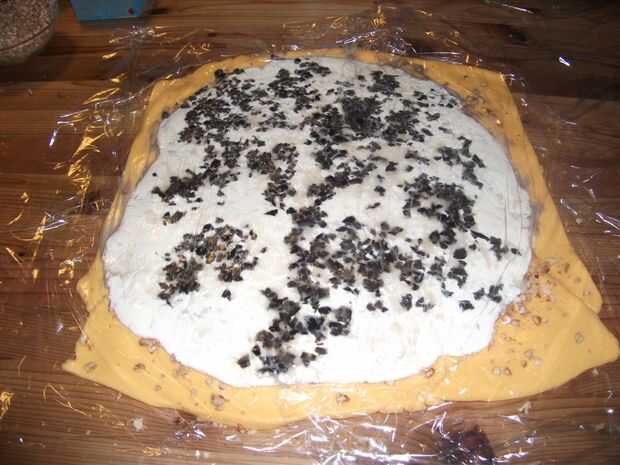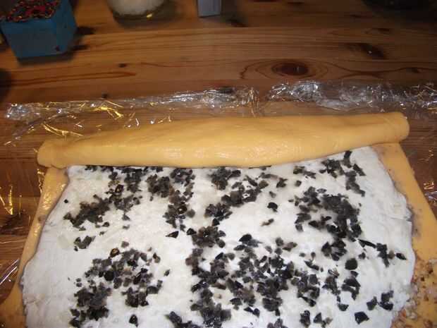 Entonces rodarla. Es como hacer un brazo de gitano. Creo que si se utiliza una capa de envoltura de plástico mientras están rodando, evitará las manos pegajosas.