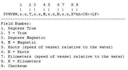 Los tres caracteres siguientes describen los datos a seguir. Otra vez, para nosotros esto es VHW agua velocidad y rumbo.