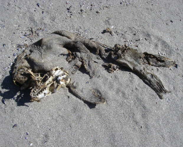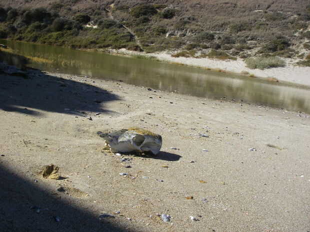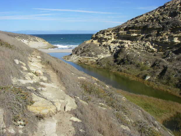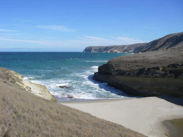 De pronto el cañón se abre y es el océano. La Restinga está adornada con varias reliquias, grumos de alquitrán de derrames de petróleo y las pistas del zorro de la isla.