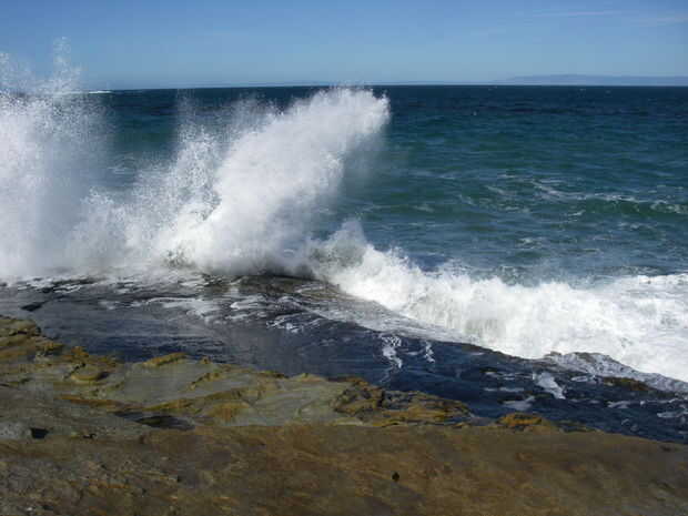 Estoy sentada sobre las rocas viendo olas romper en acantilados mientras escribo.