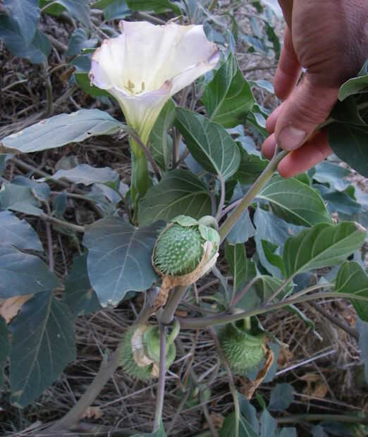 "¡ Ajá!" Pensé. "Apuesto que mala hierba de jimson a.k.a. Datura, una vez utilizado por el Chumash locales como una medicina y el ingrediente principal en"Hooch de la abuela"".