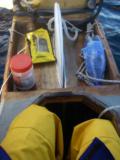 Estoy sentada con mis pies en la cabina trasera. Mi GPS está en una bolsa impermeable porque sus juntas son malas. La orza es hacia abajo porque estoy cruzando el viento. Puede flotar para arriba, así que tengo un lazo de cámara que puedo estirar alrededor de la parte de atrás de él para mantenerlo hacia abajo. La orza y el GPS son amarrados a la embarcación. Hay una botella de agua hacia fuera y un tarro de coco + avena rápida seco y trocitos de chocolate para comer.