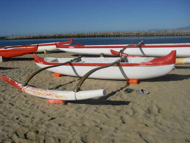 Hay algunas canoas hawaianas estacionados en la playa allí. Siempre es un signo de un buen lugar. Un club infantil. Me gusta el look de este pequeñín. Hay un astuto dolly con ruedas en una de las canoas individuales.