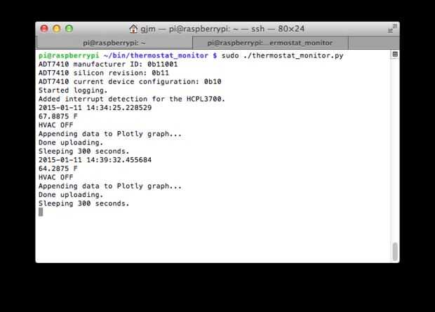 Tengo el script en Python desde boot en mi Pi, en segundo plano. Usted notará algunas espigas en las lecturas de temperatura. A veces éstos son causados cuando reinicio el ADT7410, pero otras veces suceden por razones desconocidas. He añadido código para utilizar una rutina de detección simples aislados (rolling desviación absoluta mediana) para descartar la mayoría de los picos.