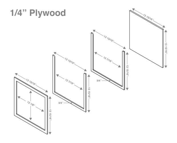 El marco es necesario tener una cavidad con esquinas biseladas en la parte superior para permitir que deslice fácilmente en y hacia fuera el registro y necesario ajuste para la parte delantera del bastidor para mantenerlo en su lugar. Hecho el espacio interior 12 7/16" de ancho para dar la manga cierto margen para mover fácilmente en y hacia fuera y hecho el marco cubre apenas los bordes de la manga en 12 1/8" a través de cada dimensión. Es importante ocultar tan poco de la manga como sea posible porque la mayoría arte va hacia los bordes.