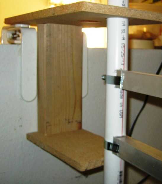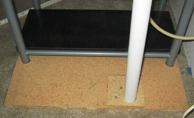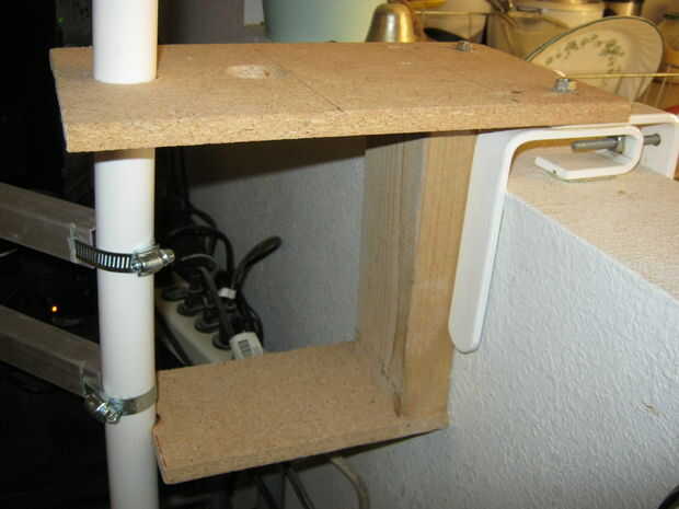 Plate(see picture) base: bien quería anclado pero recomendado: no para anclar a la pared. Mi equipo ya estaba sentado en una mesa de ordenador. Así que tomé otro trozo de tablero de partícula y perforar dos agujeros que coinciden con dos de las patas de la mesa. Las piernas pegan a través de los agujeros pero mantuvieron la base aglomerado se mueva mucho. Entonces tomó un trozo más pequeño de tablero de partícula y perforar un agujero de 35mm para el brazo del oscilación. Con sólo el 1" tubo de PVC en la parte superior y el inferior, moví el fondo por lo que era recto arriba y abajo que unido a la placa inferior con tornillos.