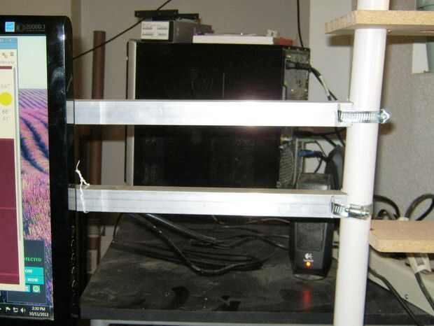 Solución: Bueno, tomó otro trozo de tablero de partícula, corte una muesca en ella y había enclavada justo debajo el brazo más bajo por lo que 'enderezado' el PVC. Tuve que tratar, corte y vuelva a intentarlo para obtener el nivel del monitor. Bueno, la pieza de nivelador no permanece en el lugar, así que corte un trozo de 2 x 4 y había atornillado a la palanca y la placa superior.