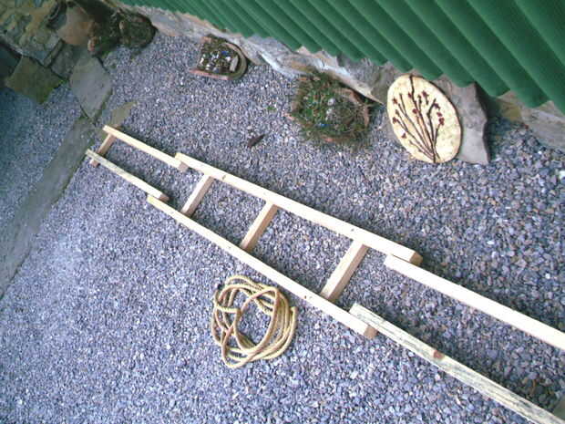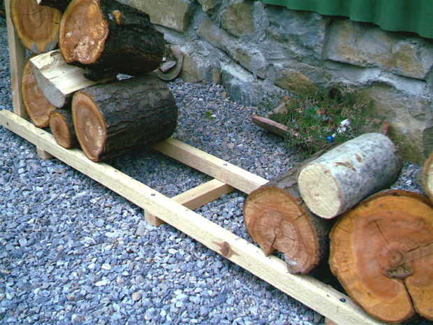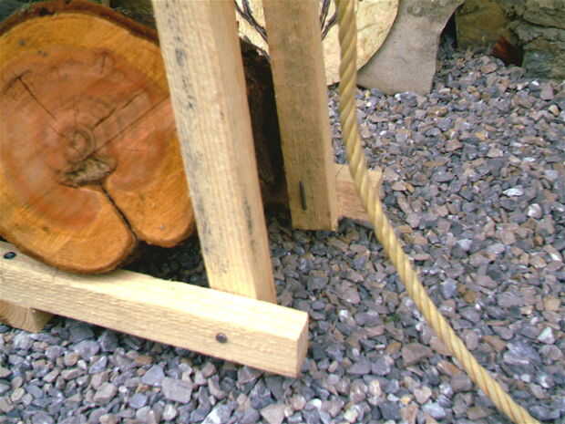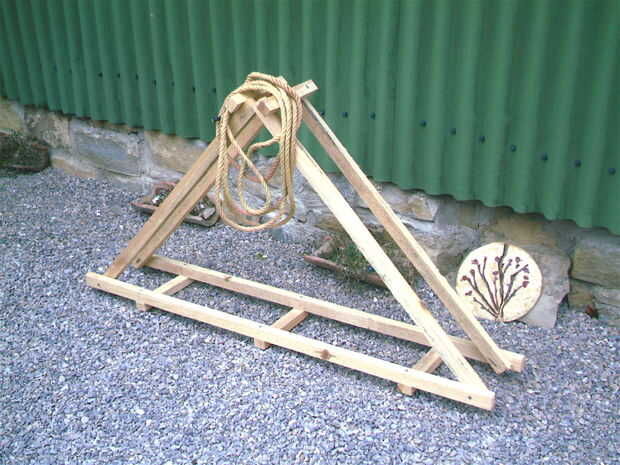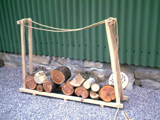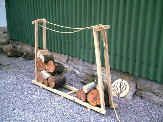 La última parte que se necesita es una longitud de cadena o cuerda para atar las dos piernas en la parte superior. Que sostiene todo rígido al que apilar los troncos en el rack.