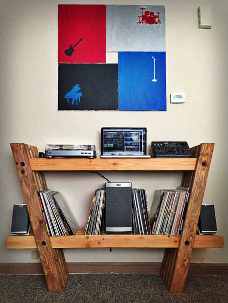 Quería sustituir este bloque barato estantería con algo más elegante y guapo, con un look moderno pero orgánico y una pieza que pudo albergar mi colección de discos, sistema de altavoces y otros equipos de estéreo. Hace un tiempo atrás, un amigo mío me mostró una foto de un soporte de LP que encontró en línea que quería construir - aunque él nunca lo hizo - y me inspiré para probar este diseño en mi proyecto. No pude encontrar la imagen de la pieza en línea así que iba en gran parte de la memoria, pero el elemento clave del diseño tenía vigas entrelazadas que crean un aspecto segmentado.
