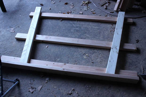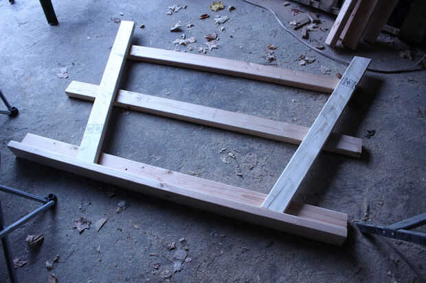 Con el corte de piezas de dos piernas, puse una capa de la plataforma en el suelo para ver si me gustaba cómo ángulo el marco parecía (ver imagen). Bueno, yo no, así que decidí lanzar la precaución al viento, ignorar todo respeto para la sensibilidad y paso al lado oscuro. 15 º. Así es, que soy un hombre loco. Esto parecía mucho mejor, así que siguió adelante y cortar los bordes angulados de mi primera junta superior para probar la forma final (una vez más, estos top juntas se cortará en forma trapezoidal con el borde lateral más largo en 55" de longitud).