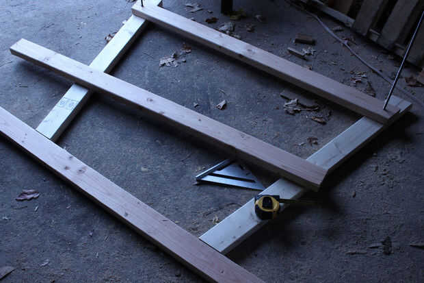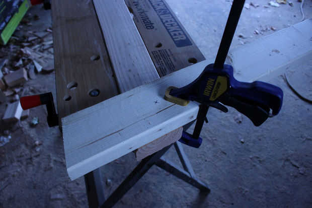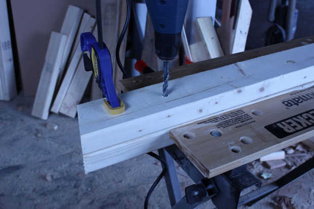 Descargo de responsabilidad: voy a ser honesto con usted aquí. Aunque es totalmente posible determinar los puntos exactos a perforar usando ángulos y ecuaciones, estaba una cuantas cervezas en este punto, y mi cabeza empezó a doler cuando sacó la calculadora y transportador de ángulos. Una mucho más simple (sí, un poco menos preciso, pero mucho más simple) es colocar las piezas en el piso y línea por el ojo. Con el par superior de los orificios perforados en mis piernas y estantes superiores, usé una barra de tensión Alinee los orificios y mantenerlos en su lugar. Entonces tomé un 2 x 4 y puso en el borde inferior de mis piezas de la pierna, girando hasta su 15 º bordes angulados sentaron al ras contra la pieza base. Con tres de mis cuatro piezas sentado en su lugar, pude colocar mi tablero inferior, asegurarse de que estaba sentada perfectamente simétrico con respecto a las piezas de la pierna y mide 13" de la pieza base y 1 3/4" desde el borde del tablero. Voila! Ahora tengo las ubicaciones de los orificios para el último par de orificios y con (esperanzadamente) sólo unos milímetros de error.