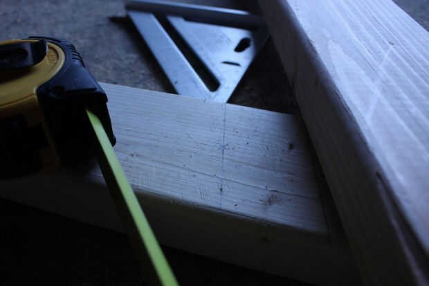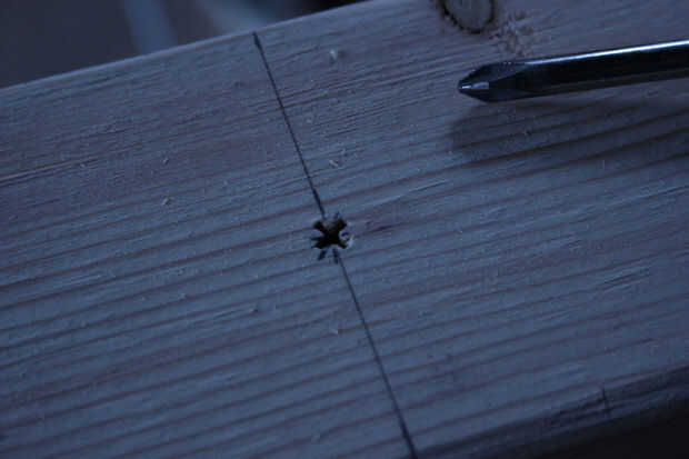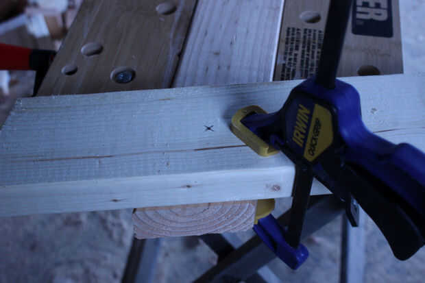 Mientras que los lados de la estantería superior quedará al ras con la parte exterior de las piezas de la pierna, las piernas sobresaldrá más allá del estante superior. Decidí esto quería fuera enferma 6" más allá del estante superior. Pero desde 2x4s que puedes comprar en ferreterías grandes-shop no 2" por 4", para asegurarse de que está perforación en el punto medio exacto en el tablero. Mis placas eran 3 1/2" de ancho, por lo que deseo medir 6" desde el borde superior del ángulo de las piezas de la pierna y 1 3/4" desde el borde lateral, estas intersecciones con un bolígrafo o un lápiz de la marca. Puesto que los tableros del estante superior tenían sus extremos cortar a 15 º, usted necesita encontrar el punto central en estas juntas y medida 1 3/4" desde el centro del borde en ángulo.