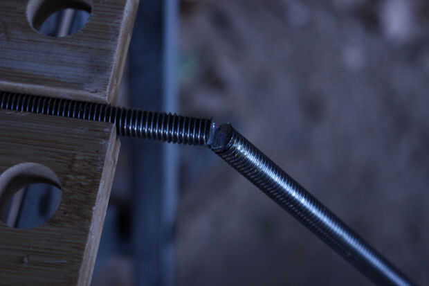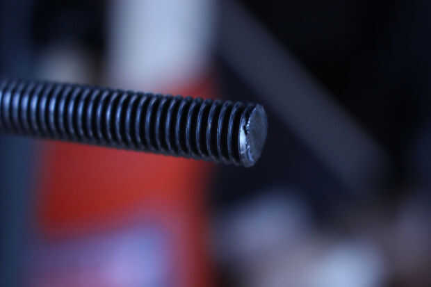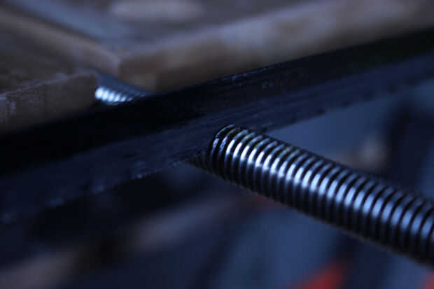 ¿Recuerde Sierra mencionado en el inventario de herramienta? Bueno es tiempo de brillar. Asegúrese de que la varilla se sujeta abajo agradable y segura. Barras de aluminio roscado son bastante suaves cuando se trata de metales, así que no te largo a corte derecho a través de él. Al llegar al final de su corte, debe ser capaz de doblar la varilla y quite el final. Ello será muy fuerte, así que tendrá que presentarla para ser suave al tacto. Ten cuidado con este paso, sin embargo, porque necesita preservar la integridad de los hilos durante la presentación de los filos de corte. Si la punta de su hilo de rosca no es presentada correctamente, usted será incapaz de conseguir la tuerca su Asamblea (confía en mí en este caso...).