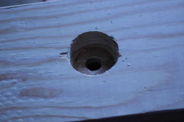 Hablando de eso, encontré un tema que no había visto hasta este punto en mi viaje de carpintería: es un dolor enorme tratando de perforar los agujeros en la parte superior los agujeros ya taladrados. Esto es especialmente cierto con una broca de pala, que realmente está haciendo más corte que está perforando. Si vas esta ruta, estar preparado para un tronzado taladro y algunas maldicen palabras. Es realmente todo acerca de encontrar la proporción correcta de velocidad y la presión para evitar que la broca de pala de conseguir pegado. En retrospectiva, una Sierra de perforación probablemente habría hecho un mejor trabajo.