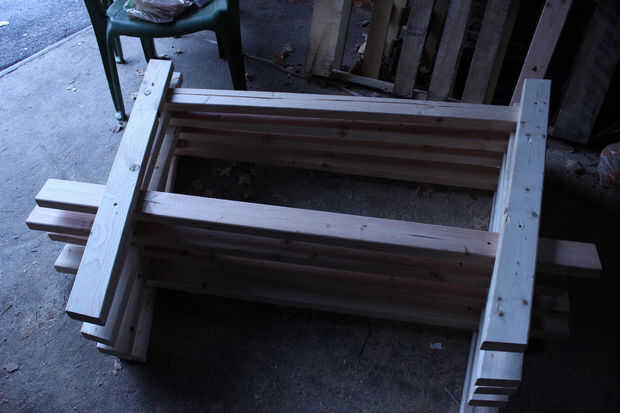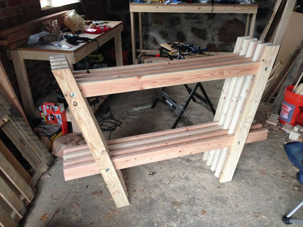 En cualquier caso... ahora eso es todo un montaje de prueba! Encontré el método más fácil (y por el montaje final) es poner todas de las piezas hacia abajo en el piso y, uno por uno, enhebrar las varillas por los agujeros. Esto tomará algún esfuerzo, como las piezas wont diapositiva sólo juntos armoniosamente. Tener un martillo o mazo que ayudan a aprovechar aún más a medida que se atascan las varillas en le ahorrará algún estrés. Una vez en las barras, puede cuidadosamente incline la estructura hacia arriba y la manivela hacia abajo las arandelas y tuercas para ver cómo encaja. Los bordes superior e inferior de las tablas (que) deben estar a nivel.
