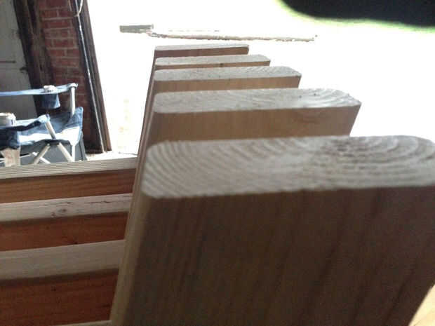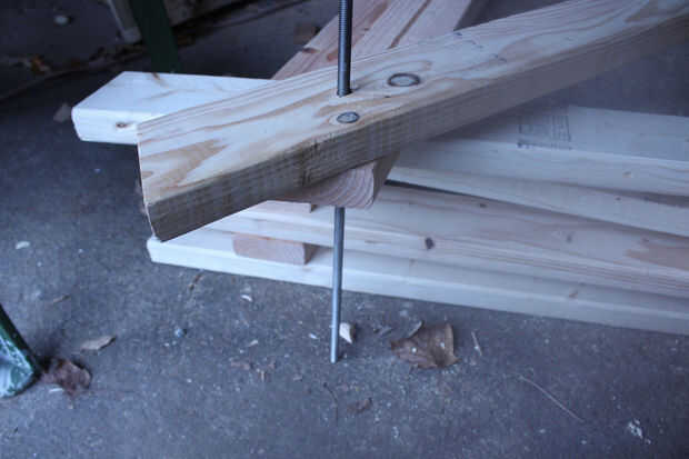 Con todas sus piezas ahora corte y perforado, casi has terminado tu proceso de montaje. Apilar uno encima de otro más o menos y tendrás una aproximación cercana de la profundidad será el proyecto terminado. Para ver exactamente cuánto necesita sus varillas roscadas que, usted puede diapositiva uno a través de un par de los agujeros perforados nuevamente hasta que esté al ras con el piso. Es importante tener en cuenta que, cuando se aprieta completamente, sus tableros de madera será más comprimido firmemente juntos que están mintiendo en el piso ahora mismo. Dicho esto, marque el borde de la varilla roscada en relación con la profundidad de las tablas de la pierna utilizando un rotulador. Para mí, esto fue en 16" de largo.