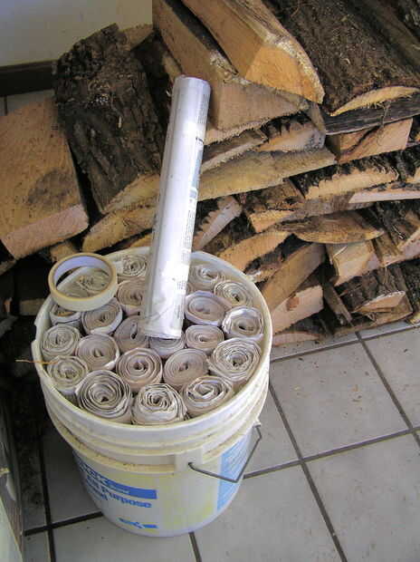 paso uno: el periódico el rodillo lo mas ajustado posible. Tomo una hoja o dos y rodillo el resto dentro de eso. A continuación, utilizar cinta adhesiva simple tapa y parte inferior para mantenerlo en su lugar. Hacer registros 2 a 3" espesor tapas.