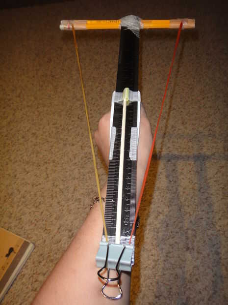 una simple pero poderosa ballesta hecha de palitos con una distancia de casi 9 metros.PRECAUCIÓN: El arco debe no ser dirigido o disparó a cualquier humano o animal. Aunque la dosis de arco no duele si dispara en la mano a quemarropa, duele Si golpea