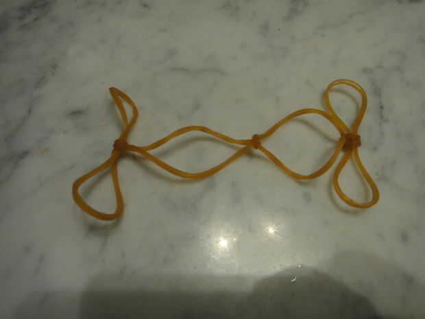 Paso 3: utilicé cuatro gomas, pero mirando hacia atrás lo probablemente pude haber hecho con dos y más poder. De todos modos nudo las bandas como se muestra en la imagen de abajo.