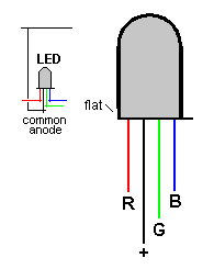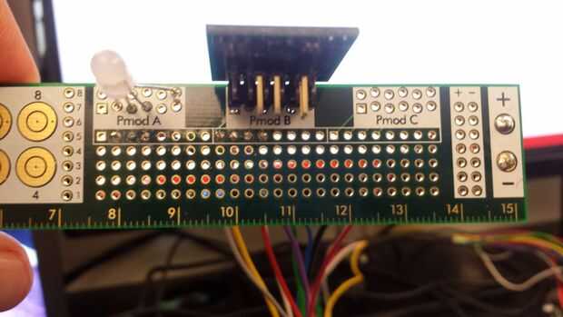 Las piernas RGB deben ser en el orden correcto para hacer referencia también la foto de arriba. De izquierda a derecha debe ser: azul, verde y rojo con el ánodo común conectado a los 3, 3V alimentación en el conector del Pmod en la regla (la energía ya está conectada en la regla).