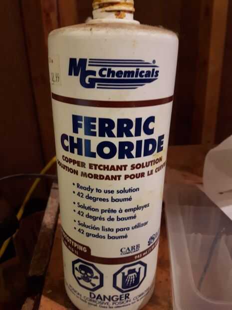 Para hacer que la transferencia de utilidad, debe sumergir la placa en un reactivo de transferencia resistir. Para esto utilicé cloruro férrico ya que era lo único que tenía puesta alrededor y han tenido muy buenos resultados con él durante los años. Uno de los trucos al uso de las cosas es para asegurarse de que el PCB todo está cubierto, y la solución se mantiene caliente mientras que grabado.