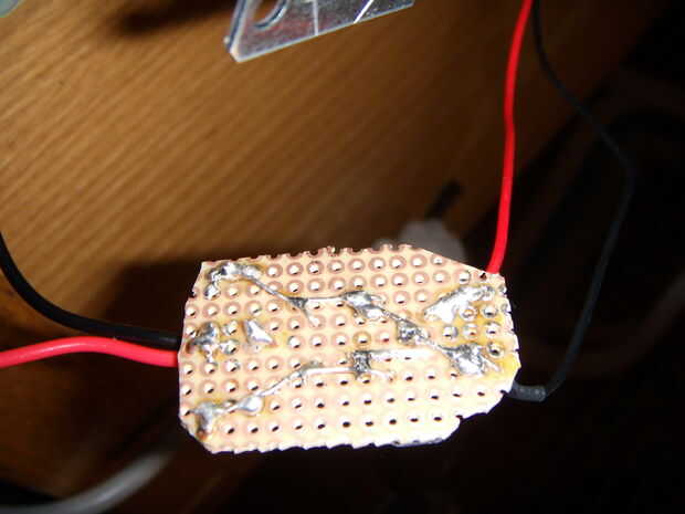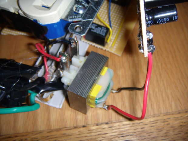 A continuación sueldan los dos cables de mi transformador a cada lado de la pista de la energía. La bobina secundaria o cables con un voltaje menor, entonces se canaliza en la configuración del rectificador y el regulador.