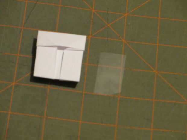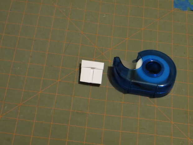 Conseguir alguna cinta. (Foto 1)  Corte un pedazo corto, alrededor de dos pulgadas de largo. (Foto 2)  Doblar sobre sí mismo para hacer la cinta de doble cara. (Foto 3)  Por último, pegarlo en la parte posterior.  (Elegir 4)