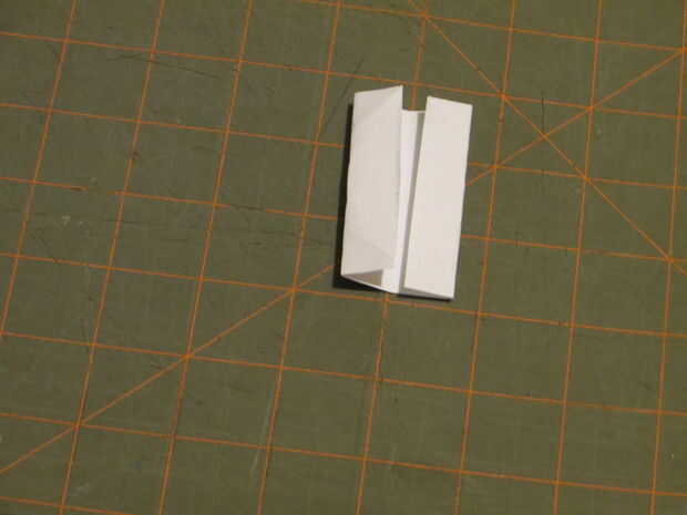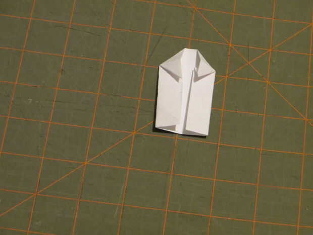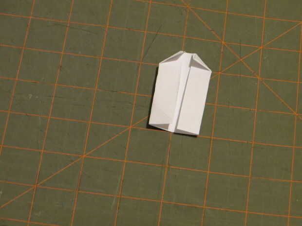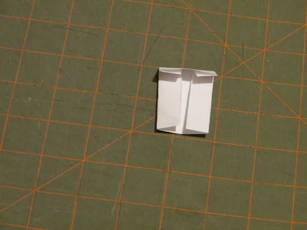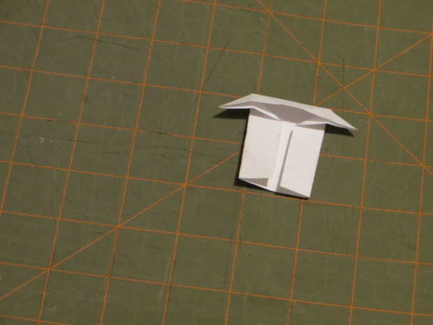 Tomar las dos líneas poco va diagonalmente en cada una de las esquinas. (Foto 1)  Doblarlos hecho a lo largo de ese pliegue. (Foto 2) Hay una línea invisible donde se unen los bordes de dos fondo de los triángulos.  Doble hacia abajo en esa línea.  (Foto 3)  Ahora, hacer una calabaza doble en la parte para convertirla en la foto 4.  Ahora separe las mitades de la parte inferior de esos triángulos en distintas direcciones, haciéndolo parecer Pic 5