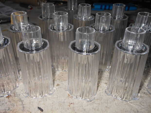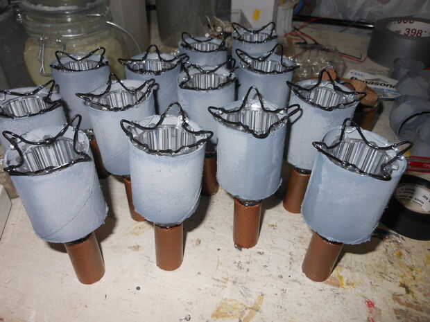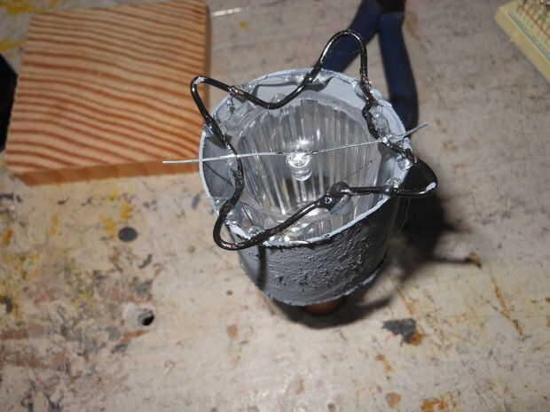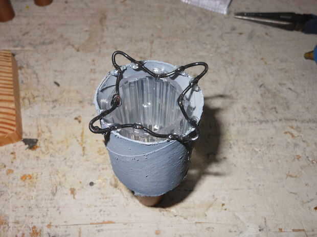 Cada vivienda de LED con el reflector se presiona en el tubo pintado. A continuación concedo la estrella de alambre con pequeños toques de pegamento caliente, seguido por el más grande gris tubos de cartón, también Unidos a la estrella de alambre por el pegamento caliente. Llegó el LED, con las piernas dobladas a 180 grados y caliente pegado en su lugar, emisor apuntando hacia abajo en el reflector. Cuando todo fue hecho, puse un poco de epoxy en cada empalme del pegamento caliente para un enlace permanente.