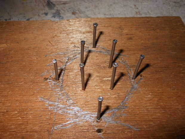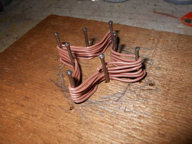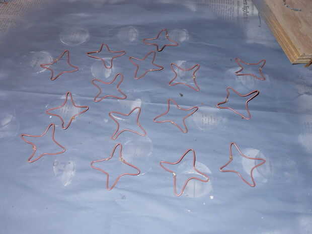 Necesitaba un cuatro estrellas de alambre puntiagudo en la parte superior de cada LED de la vivienda, tanto para la precisión y estabilidad. Utilizando un trozo de madera y unos clavos, construí una plantilla simple, envuelto mi cable de núcleo sólido alrededor de él y entonces las cortó. He añadido una cucharada de pegamento caliente el lugar quisiera cortar cada estrella para mantenerla en una sola pieza.