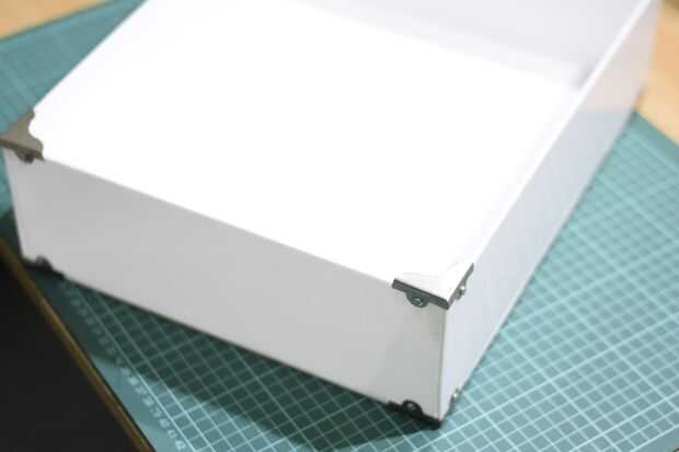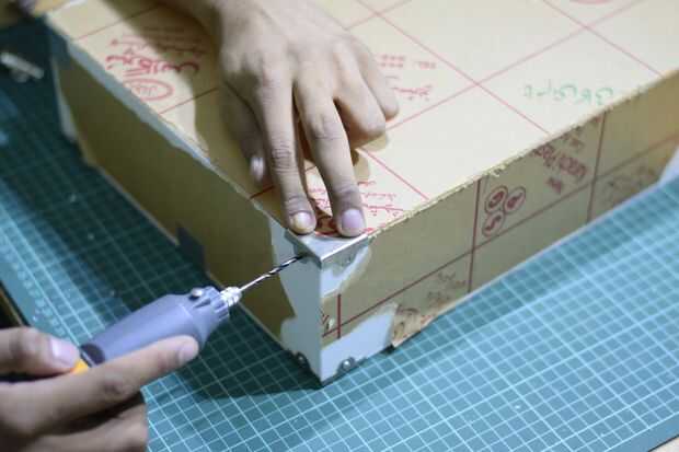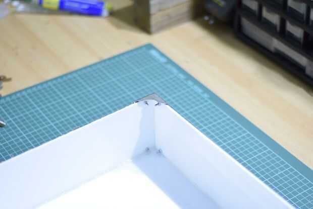 Ahora sigamos con los soportes. Retire el papel protector de los lados de la parte inferior cuatro. Coloque los soportes de esquina y marcar el punto a perforar. Perforarlo y luego fijar los soportes con tornillos y tuercas. Ahora a la parte superior. Coloque la pieza de plexiglás claro en la parte superior pero no pegue. Coloque los soportes y marque los orificios. Saque la pieza superior y garantizar dos de los soportes. Dejar los otros dos. La pieza de arriba debe deslizarse en los soportes y el usar los dos restantes, asegurados en su lugar. Revise para asegurar ajuste apropiado y arena cuando sea necesario. Una vez hecho esto, saque la pieza superior.