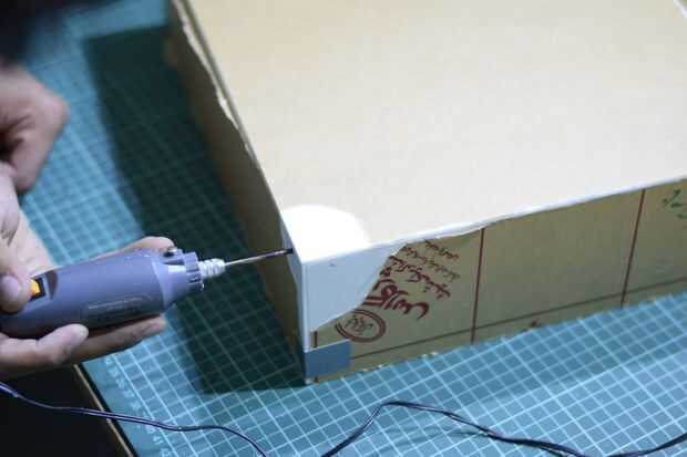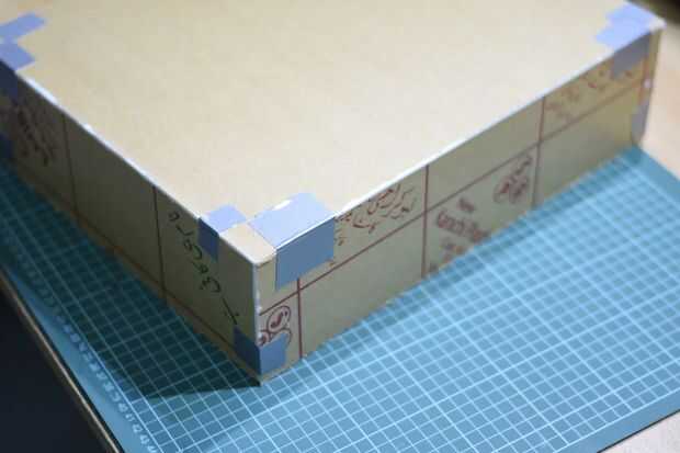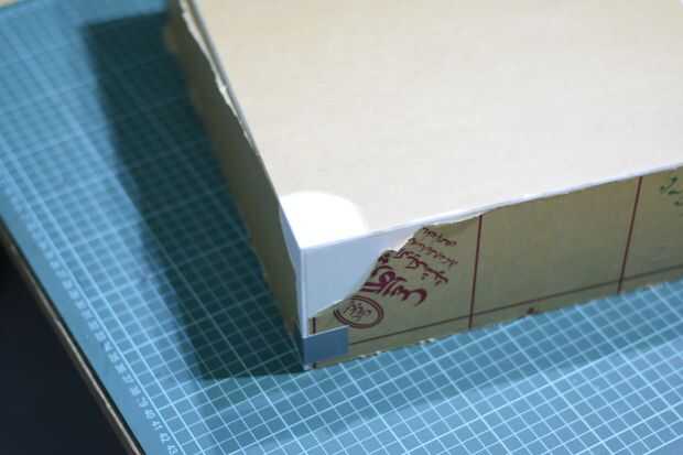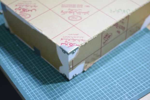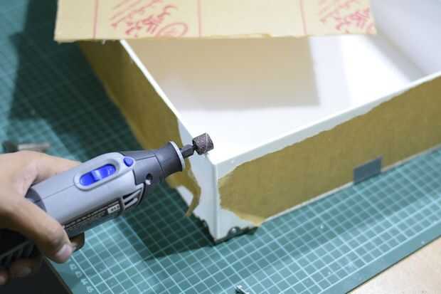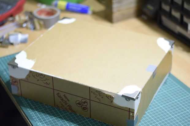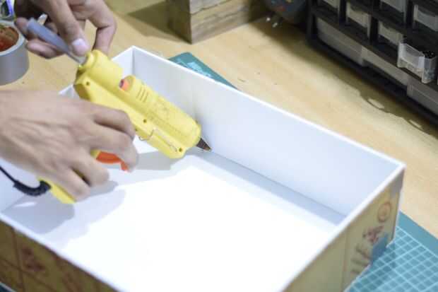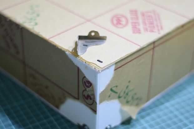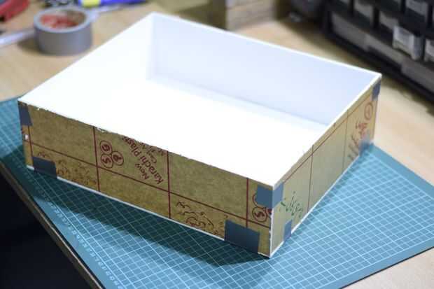 También necesitamos una pieza más para colocar dentro de este cuadro pero más en eso más adelante. Lo que hará es quitar el papel protector de un lado de las hojas. Luego, coloque que hacia de lado, use cinta para secar encajan todas las piezas para formar una caja abierta. Compruebe la conexión y archivo cuando sea necesario para conseguir que se ajuste correctamente. El uso caliente pegamento y aplicar en el interior los bordes. Ahora la caja es segura.