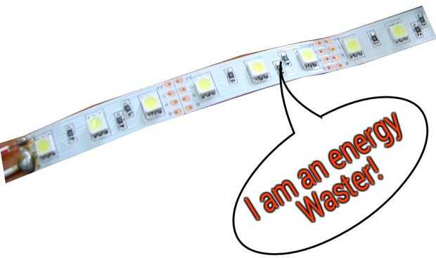 Recuerde siempre que los leds son dispositivos de corriente constante. Una vez conducido de esta manera el sistema de iluminación todo será extremadamente eficiente. Aléjate de esas tiras baratas y arreglos de discos que tienen los resistores smd estúpido. La segunda foto muestra un ejemplo de una popular tira led con resistencias smd. Maldigo el sistema de iluminación de fabricantes de estos bajo costo ineficiente conducidos. Debe ser todo colgados.