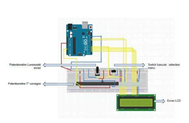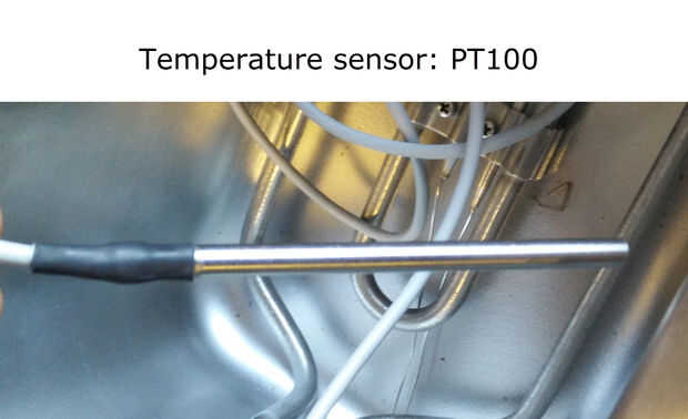 El sensor que utiliza para comprobar la temperatura del agua es una PT100. Mide la temperatura por la variación de su resistencia. Si tenemos 100 ohmios entre los pines de la PT100, significa que la temperatura es 0° C. Cuando el agua se calienta, aumenta la resistencia de la PT100. Esta resistencia se mide por uno de la entrada analógica de la Arduino Uno, a través de un puente divisor de tensión (un amplificador de potencia se utiliza para multiplicar la tensión a través de la PT100).