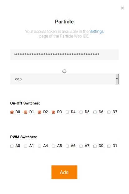• Aquí aparecerán todos los dispositivos de partículas que se ha subido a la nube de partículas. Seleccione el botón específico que quiere ser de mando con Sensorflare.