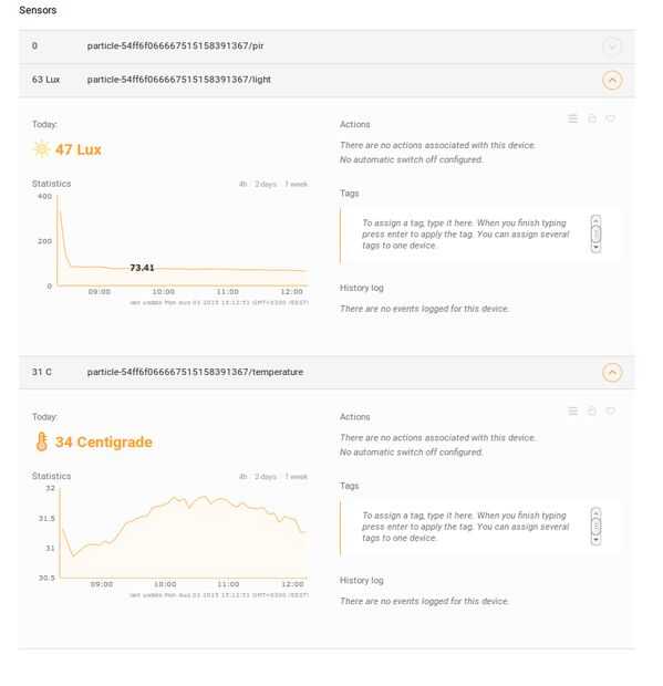 • Puede comprobar los valores del sensor en Sensorflare. Aquí se observará las variables que han sido publicados en su base de código. El PIR, temperatura y valores de los sensores de luz están disponibles en este ejemplo.