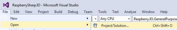- Vaya a donde extrajo la carpeta de frambuesa-sharp-io-master y abra el archivo RaspberrySharp.IO.sln.