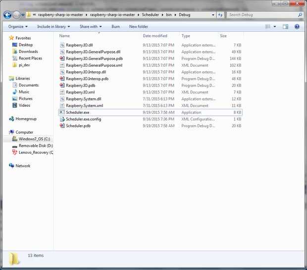 Esto construir el archivo Scheduler.exe y coloque todos los archivos dependientes en el directorio bin\Debug del proyecto. Su proyecto estará en la carpeta de frambuesa-sharp-io-master.