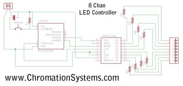 Como un circuito simple como puede ser. Un 12F675 controla un registro de cambio de alta potencia, que a su vez controla hasta 48 LEDs en 20ma por, (~ 120mA por canal) en channels(groups) 8,